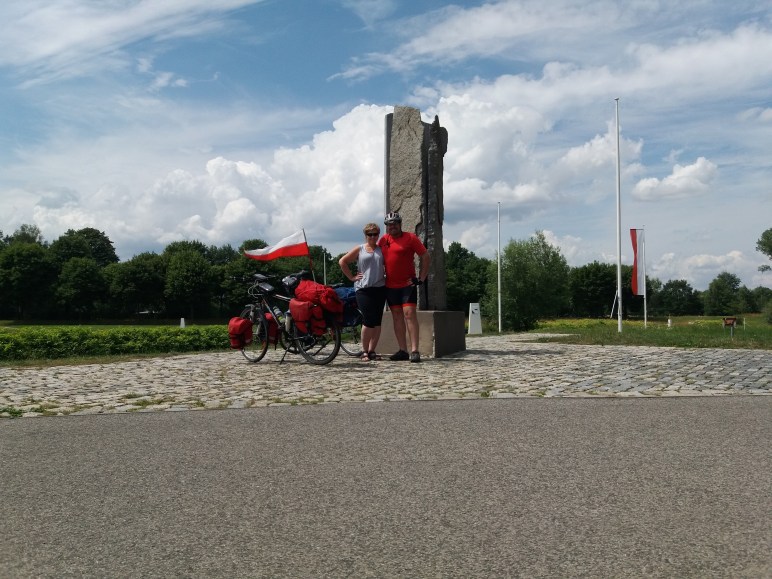 Zanim jednak do Bogatyni, ruszyliśmy do Trójstyku. W międzyczasie napotkaliśmy parowóz… wąskotorowy!!! Ciągnął wagony przez miasto i pogwizdywał radośnie. Dymił i wzbudzał powszechny entuzjazm. Natychmiast gromadzili się gapie i robili zdjęcia. Następnym razem zafundujemy sobie przejażdżkę! Trzy granice, Czech, Niemiec i Polski, spotykają się w jednym miejscu, a w nim my: Ania i ja, na rowerach. Do tego przeczystej czystości woda w Nysie Łużyckiej i piękna pogoda. Pomnik, trzy flagi i… krzyż Króla Polski!!! Tyłem do Trójstyku!!! Strzeliliśmy serię zdjęć i ruszyliśmy do Bogatyni. Najpierw, aleją Trzech Państw wjechaliśmy w Czechy, a potem szosa nr 332 wjechaliśmy przez Kopaczów do Polski. Wspięliśmy się na wysoką górę, skąd rozpościerała się przepiękna panorama na Czechy, Niemcy i Polskę. No i zauważyliśmy kopalnię węgla brunatnego z elektrownią w Turowie. Dziura w ziemi tak wielka, że ledwo można wzrokiem ogarnąć!!!