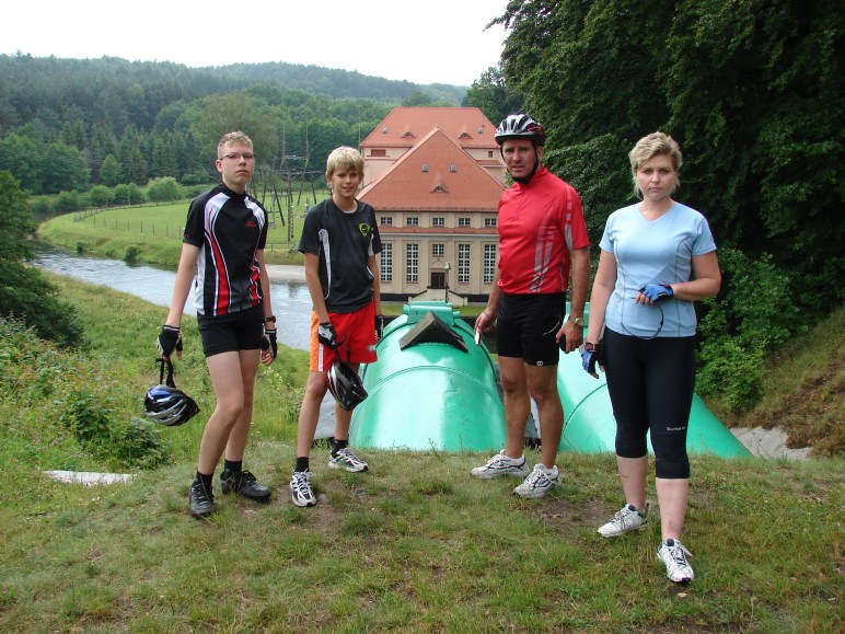Ponieważ padało trochę dłużej, a i nie wyjechaliśmy z Dębnicy zbyt wcześnie stwierdziliśmy, że od teraz jedziemy najkrótszą drogą do Bytowa, zaliczając oczywiście elektrownię wodną w Gałąźni Małej. Oczywiście nie dość, że droga do elektrowni wiodła pod górę, to jeszcze były to ogromne, poniemieckie kocie łby. Stanęliśmy w miejscu gdzie kanał spiętrzonych wód Słupii biegnie… pod ziemią!!!