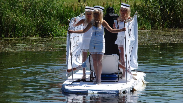 Pożegnaliśmy się z miłym, młodym zawiadowcą pola i ruszyliśmy do Braniewa szosą 504. Ruch był niezbyt duży i jechało się bardzo przyjemnie. Po wjechaniu do Braniewa, do naszych uszu dochodziła raz po raz, mowa spikera przez głośniki. Okazało się, że zajechaliśmy akurat na X Mistrzostwa Pływania Na Nietypowym Sprzęcie, po nieco spiętrzonej w mieście rzece Pasłęce. Tłumy ludzi i kupa śmiechu. Widać, że konstruktorzy włożyli mnóstwo energii i serca w te zadziwiające i pomysłowe, pływające projekty.