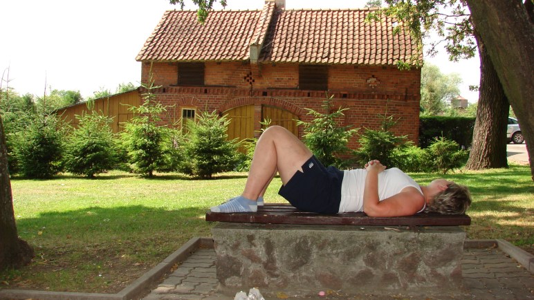 Dojechaliśmy do szosy i pojechaliśmy w stronę Barcian. Tam opadliśmy z sił. No to do restauracji. A tam trafiliśmy na gościa, który był hobbystą tych terenów. Pokazał nam zdjęcia miejsc już zapomnianych i miejsc, które warto odwiedzić. Na koniec chcieliśmy iść do wielkiego kościoła, ale okazał się być zamknięty. Po obiadku wwlekliśmy się do parku i w cieniu po prostu się położyliśmy. To był czas na sjestę, a tak naprawdę, to w takim upale nie dało się jechać. No to poleżeliśmy sobie w Barcianach, skądinąd znanych ze sławnego obywatela, uczestnika konkursów SMS-owych w Polsce.