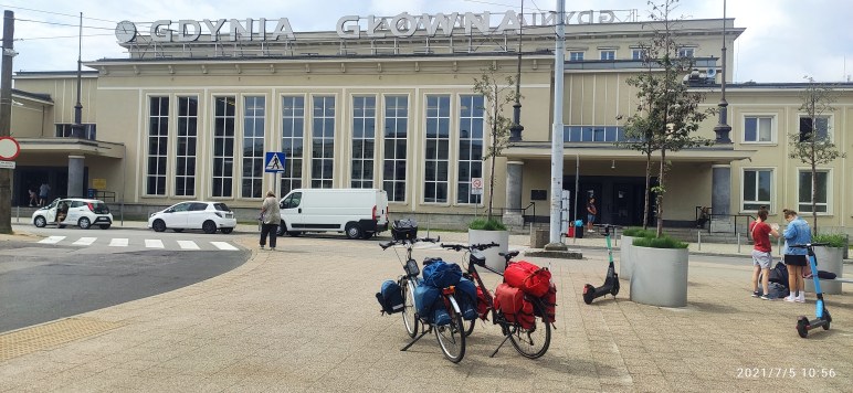 Nasze, tym razem gdyńskie rowery, zostały gruntownie obstalowane do tegorocznej wyprawy. Wszystko, jak w całej Polsce, musiało być na plus! No to u nas był „Warstat +”[1], czyli potrzebne narzędzia i trochę takich „anóżek”, i zapas części z dętką, albowiem Ania i ja mamy teraz takie same koła, 28+. Objuczyliśmy rumaki niby letkimi+ jak nigdy sakwami i ruszyliśmy w stronę dworca kolejowego. Było z wiatrem+ i zdecydowanie z górki+. Liczyłem na ten zachodni wiatr w tym roku. W końcu przeważają w Polsce i dlatego zaplanowałem wyprawę z zachodu na wschód, aby wiało nam w plecki, a uczestnicy zadowoleni byli+.