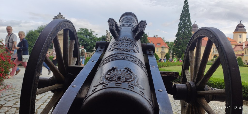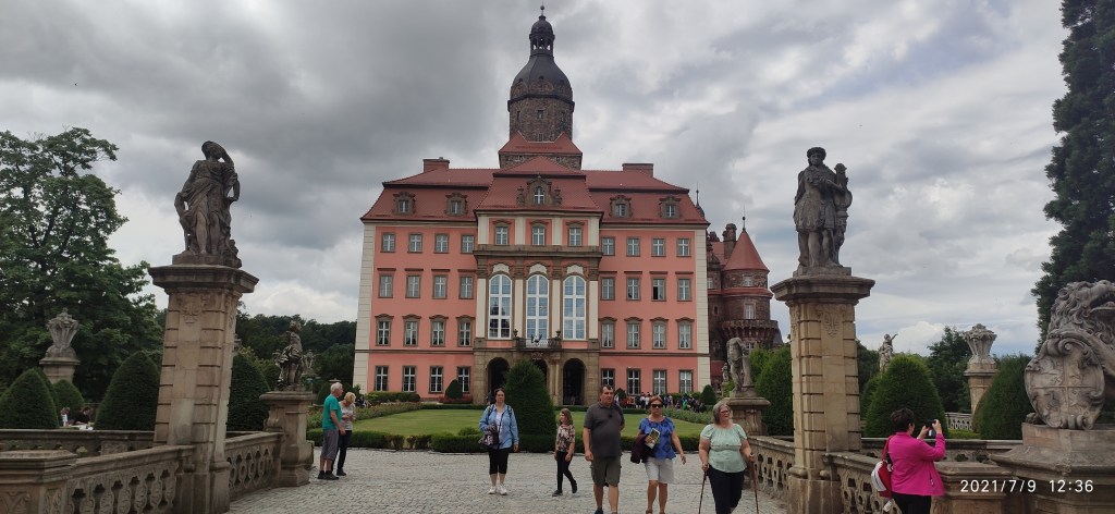 Ponieważ wczoraj, dojeżdżając do Wałbrzycha ulicą 1 Maja, od razu zobaczyłem plan filmowy filmu Sztuczki, którego jestem fanem, odpadła nam pierwsza atrakcja i zaliczona została od ręki. Największa atrakcja czekała nas jednak w zamku Książ. Pojechaliśmy autobusem miejskim przez Szczawno-Zdrój. Najpierw w oczy rzuciły się niezbyt zadbane budynki. Potem w kość dała nam modernizacja głównej ulicy, przez którą dojechaliśmy nie tam gdzie trzeba. Nawet miejscowi byli zdziwieni, że nastąpiła zmiana trasy autobusu. Potem okazało się, że nazwy przystanków po przeciwnych stronach jezdni nie różnią się tylko numerami i chcąc powrócić do tego samego miejsca w mieście, wywieźli nas znowu gdzie indziej. Na końcu, zapytaliśmy mieszkańca gdzie jest rynek. Gdy wysiedliśmy z autobusu, wskazał nam miejsce, gdzie kiedyś handlowali warzywami. Na szczęście do Rynku miasta nie było daleko. Tak więc wysnułem wniosek, że Wałbrzych zdecydowanie nie był przyjazny turystom. Ale co chcieliśmy, to zobaczyliśmy. Na koniec zakupy. Moje wyprawowe wyposażenie wzbogacone zostało w komin na głowę pod kask. Upał i wysiłek moczyły moje oczy potem i szczypało. Od dzisiaj nie będzie.