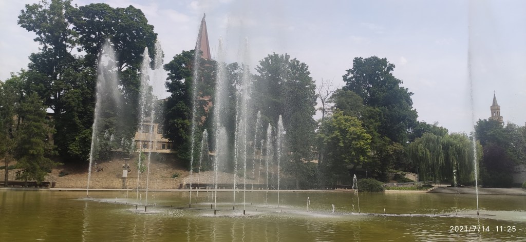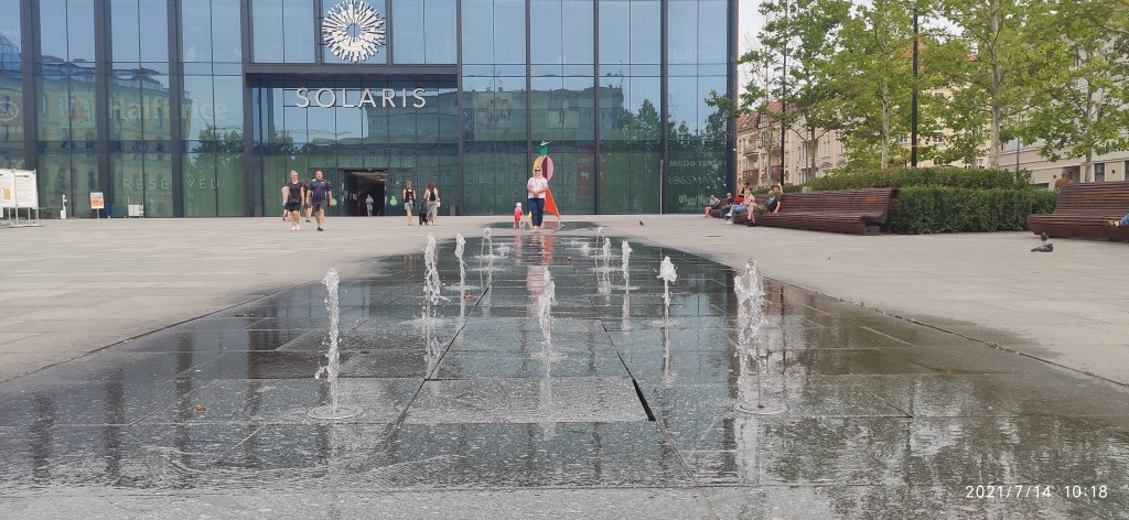Zaraz po wyjściu poszliśmy na widownię amfiteatru no i oczywiście popatrzeć na tą naszą narodową scenę. Można było stanąć także na deskach, ale nie ciągnęło nas aż tak. Potem przeszliśmy wzdłuż fontann parkowych i uciekliśmy do klimatyzowanych pomieszczeń galerii handlowej. No nie dało się wytrzymać, tak było gorąco.
