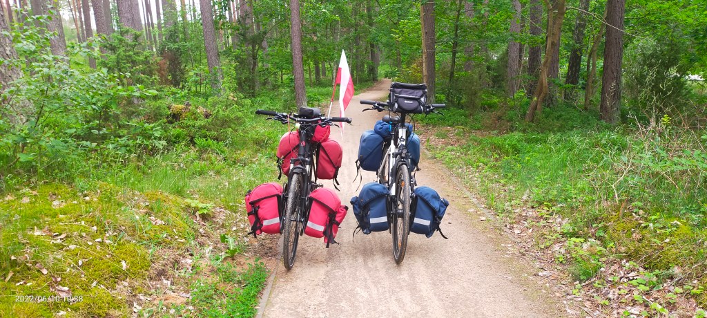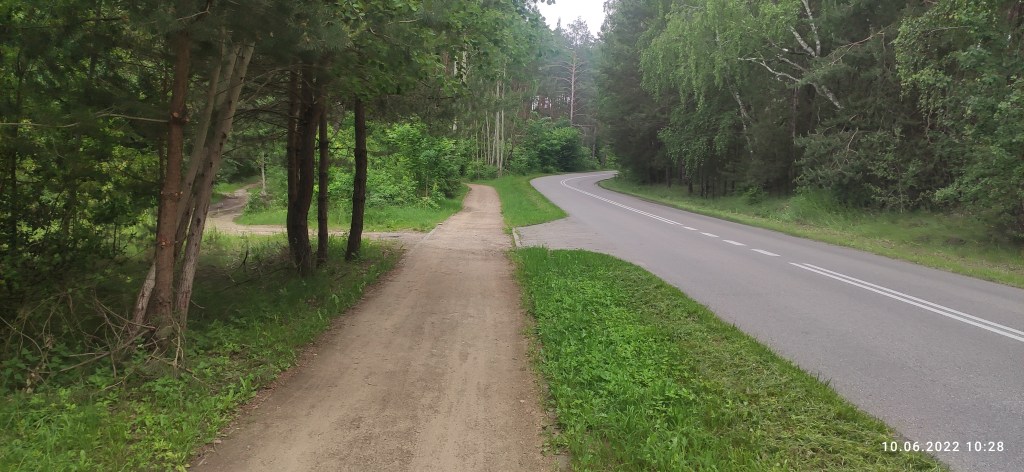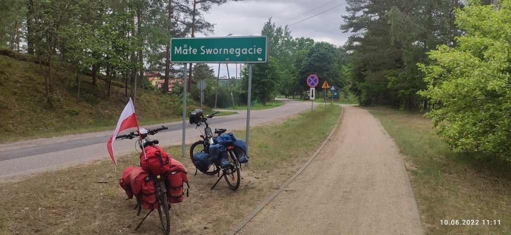 W nocy popadało i krople z drzew spadały nam na głowę, ale tylko na początku etapu. Trzeba przyznać, że ścieżka rowerowa do Swornegaci była pierwszego sortu. Wytyczona wzdłuż szosy, częściej w oddaleniu i między leśnymi drzewami. Nie była asfaltowa, jak w Niemczech, tylko z mocno ubitego szutru. Pomimo deszczu – twarda jak stół! Moim zdaniem, bardziej ekologiczna. Jechało się nam pierwszorzędnie.