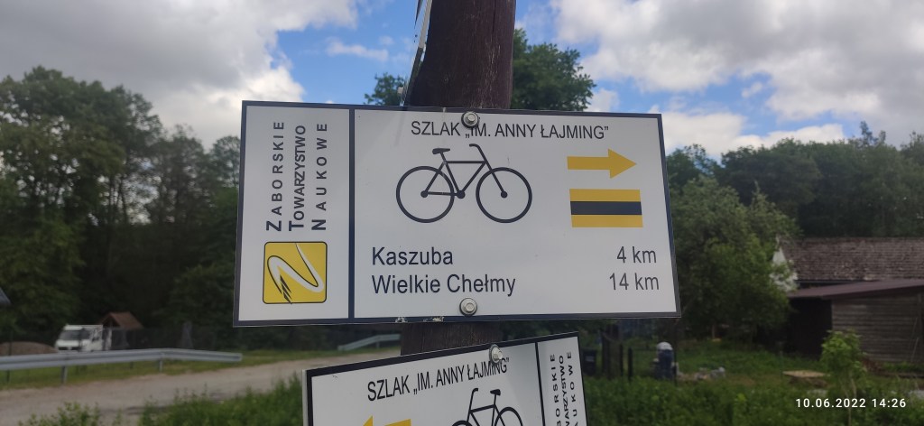 I tak dojechaliśmy do Parzyna, gdzie natknęliśmy się na szlak rowerowy imienia Anny Łajming, a potem do Przymuszewa. Choć na tabliczkach moją uwagę przykuły nazwy miejscowości a nie patron szlaku! Tak się złożyło, że kolega z wojska nosił hełm w takim rozmiarze, tylko nie pamiętam ile ich miał 😉. Oczywiście zdaję sobie sprawę z różnicy pisowni i znaczeń słów ale czasem i pośmiać się trzeba!