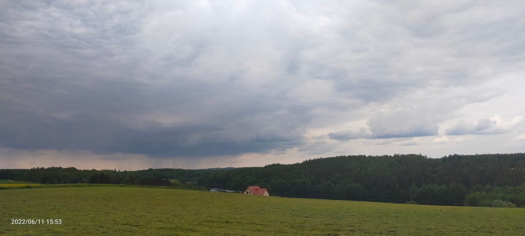 Tuż przed Piaszczyną wjechaliśmy na krajową 20. Ruch samochodowy był niewielki i dlatego nie dobiliśmy do szlaku po zwiniętych torach. Chcieliśmy jak najszybciej dojechać do celu a ostatnie kilometry to był bardzo długi zjazd. Bokiem, przed horyzontem przechodził deszcz, dając orzeźwiający powiew.