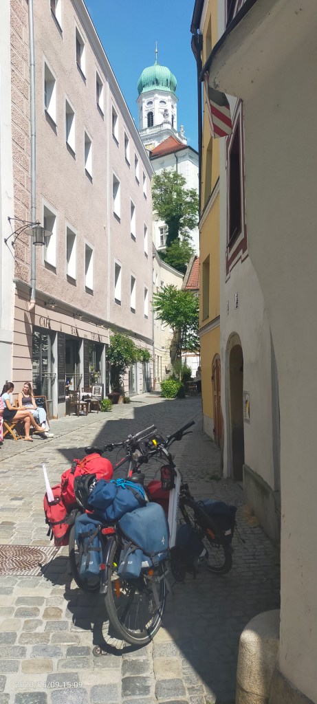 Oczywiście, że zajechaliśmy do centrum starego miasta. Kręte, wąskie uliczki z kilkusetletnimi kamienicami doprowadziły nas przypadkowo do baru ze spatzlami. Nie, żebym był wytęskniony klusek, ale lubimy. Tym bardziej, że lokalna, bawarska kuchnia nas ciekawiła, a kluski to potrawa bardzo przyjazna rowerzystom. No i samoobsługa sprzyjała zamówieniu potraw po niemiecku, choć obsługa mówiła po angielsku. Przy pomocy tłumacza w telefonie, nauczyłem się zamówienia po niemiecku i poszedłem do baru. Gdy przyszła moja kolej zamawiania, zaznaczyłem po angielsku, że to będzie moje pierwsze w życiu zamówienie, składane po niemiecku. Cała obsługa zamarła. Gdy wypowiedziałem moje zamówienie, młody chłopak poprawił tylko wyraz „spätzle”, które źle wymawiałem. Uff, jednak nie będziemy głodni! No i otrzymaliśmy dokładnie to, co zamówiłem. Nie taki ten „austriacki” straszny…
