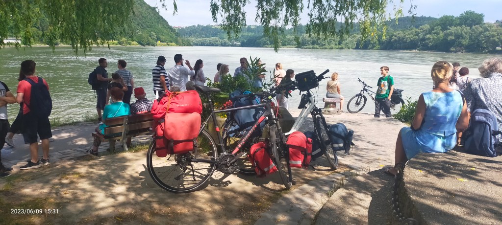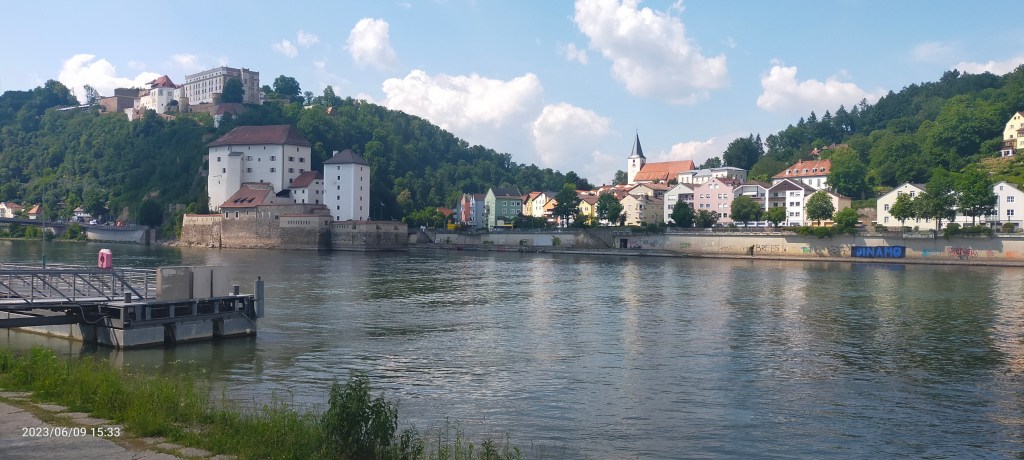 Dlaczego zaczynaliśmy w Pasawie? A dokąd mieliśmy pojechać, my, ludzie z Trójmiasta? Oczywiście, że do Trójrzecza! To właśnie w Pasawie mieszają się wody trzech rzek: Dunaju, Inn i Ilz. Ta trzecia, najmniejsza, wcale nie była łaskawa w przeszłości dla miasta, o czym można było przeczytać na infopunktach. Zatrzymaliśmy się na chwilę u zbiegu rzek, turystycznej atrakcji tego miasta. Gołym okiem można było zobaczyć, jak mieszają się ich wody.