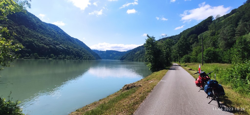 Po godz. 1100 zatrzymaliśmy się w Aschach. No bo jak tu się nie zatrzymać, jak wzdłuż naddunajskiej ścieżki, pełno kawiarni, restauracji, barów i lodów. Ślinka pociekła i nam. Stanęliśmy pośród setek rowerów i usiedliśmy pomiędzy rzeszą rowerzystów, zajadających ciasta pod parasolami. Ania postanowiła także zamówić coś słodkiego w kawiarni, a ja zająłem jeden z nielicznych wolnych stolików. Ania przyniosła Sachertorte (tort Sachera), który słynie w całej Austrii ze swej wyjątkowości. Gdy zaczęliśmy degustować, podeszła do nas kelnerka i zapytała o coś po „austriacku”. Ale nie tak krótko, tylko mówiła z 10 sekund. I wtedy Ania ze spokojem odrzekła – Nein, danke. Kobieta odeszła z uśmiechem na ustach. Ponieważ niezrozumiałem ani jednego niemieckiego słowa, zapytałem Anię, o co szło? Ania prawie dusiła się ze śmiechu. Powiedziała, że nie miała pojęcia, o co chodziło, ale domyślała się, że pewnie o to, czy czegoś nam więcej potrzeba. Podsumowałem, że Ani niemiecki przyszedł o wiele łatwiej i szybciej ode mnie. Ja bez tłumacza Google bym sobie nie poradził. A swoja drogą, dobrze jest mieć takiego towarzysza podróży, który przejmie od ciebie pałeczkę, tak od czasu do czasu.