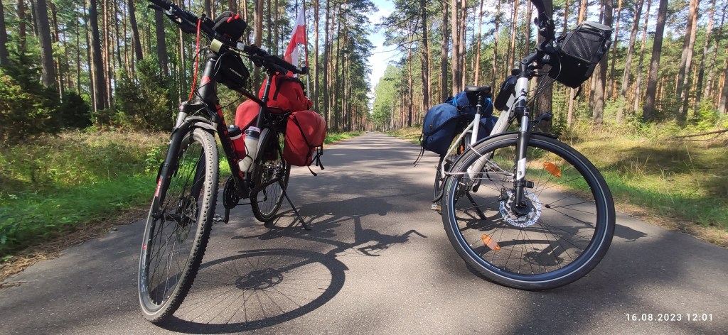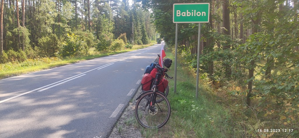 Za Pomocą, a przed Kopernicą było trochę piasku. Minęliśmy sporo rowerkowców, którzy zapewne objeżdżali jezioro. Byli bez sakw. Tylko bidony. A za Kopernicą promocja! Wjechaliśmy na piękny, leśny asfalt. Nic dziwnego, wszak zmierzaliśmy do Babilonu!
