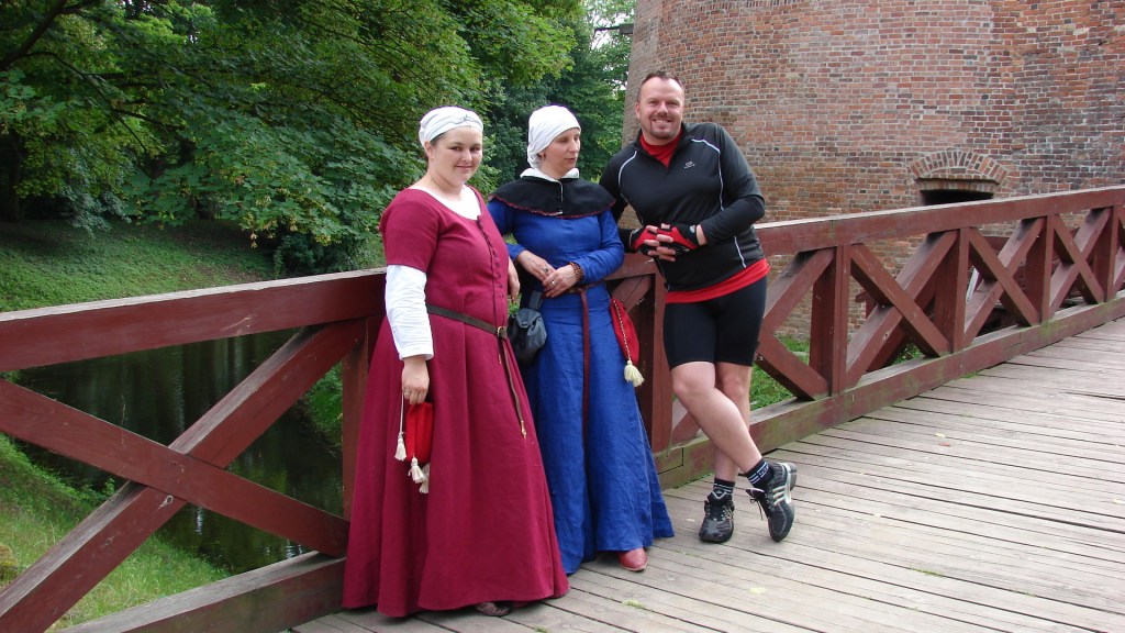 Dojeżdżamy do Kolonii Kęszycy i asfaltem, a potem ścieżką od cmentarza, dojeżdżamy do centrum Międzyrzecza. Szukamy baru i znajdujemy takie coś, jak bistro przy targowisku. Bardzo dobre flaki i nugetsy. Po posiłku przez miasto – na zamek. A tam akurat, Mocium Panie, wojów, rycerzy, pospólstwa, kramarzy i wszystkich innych warstw społecznych średniowiecza spotkanie. No to Ania za 15 talarów zakupiła swojską kiełbasę i szynkę wędzoną. Ja w międzyczasie zapoznałem białogłowy. Niestety, nie dostałem pozwolenia na zakup szyszaka. Byłby mi za kask służył do roweru.