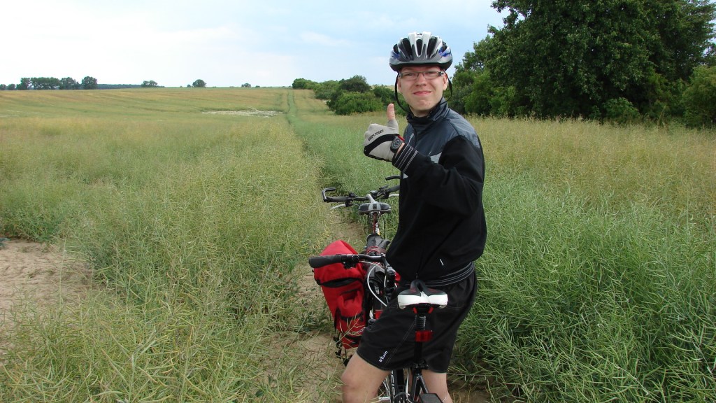 Z lasu wyjechaliśmy prosto w … rzepak. Zrazu, póki rzepak był rzadziuchny, można było śmiało jechać, potem jednak zgęstniał i moje dwie boczne sakwy zaczęły stawiać opór, co najmniej taki, jak porządna góra. Pierwszy raz w życiu przyszło nam jechać rzepaczaną drogą. Właściwie to jechaliśmy przerwą technologiczną na koła traktora. I tak 1,5 km. Po drodze nawet siekło na krótko deszczem. 5 minut zwłoki.