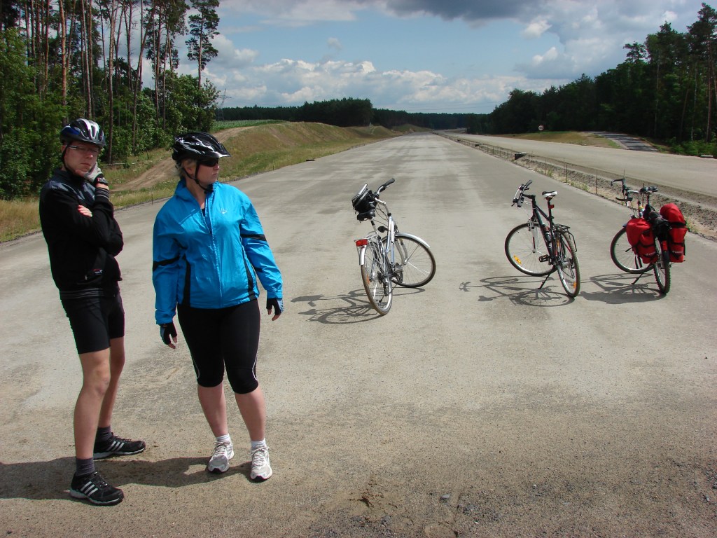 W wiosce Żelechów, odbiliśmy w polną drogę, która miała nas doprowadzić do Lubrzy. Jednak, ku naszemu wielkiemu zdziwieniu, przez naszą polną drogę przebiegała … autostrada A2. Tyle, że w budowie! Nie było na niej żywego ducha. Nawierzchnię stanowiła warstwa betonu, po którym można było jechać, prawie jak po stole. No to stanęliśmy i nosy w mapę. Szybka decyzja i postanowiliśmy, że dalej pojedziemy tą… rowerostradą, do skrzyżowania z szosą nr 3. Pomysł przeszedł jednomyślnie i przez aklamację. Jako, że była sobota, to pracowników na przyszłej A2 i sprzętu nie było widać. No to pognaliśmy. Kilometr z wiatrem bez pedałowania z górki i kilometr pod lekuchną górę. I tak dojechaliśmy do placu robót przy wiadukcie do Lubrzy. Nawet przejechać nie szło. Wiadukt był w budowie. No to postanowiliśmy już wtedy zjechać z tej najszerszej jak dotąd, ścieżki rowerowej i przebrnąć przez Lubrzę.
