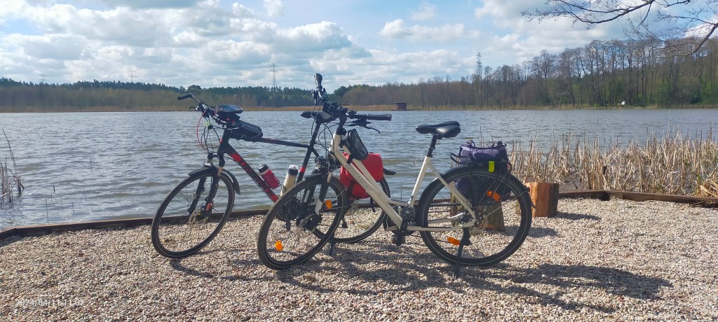Potem wpedałowaliśmy do wielkiego Lasu Szpęgawskiego. Wyraźnie oznakowany rowerowy szlak Joannitów zawiódł nas najpierw nad piękne jezioro Jamertal. Poza pięknym widokiem, zobaczyłem wystające z jeziora dziwne, stare już pale, pozostałość po jakimś pomoście. Z tym, że pomost musiał być dziwnie długi. Wtedy tego nie rozgryzłem. Dopiero internet podpowiedział mi, że właśnie na tym jeziorze zbudowano filmowy Spychów z „Krzyżaków”!!! A zatem film! Lubiłem go i oglądałem kilkukrotnie. No to muszę zobaczyć jeszcze raz!
