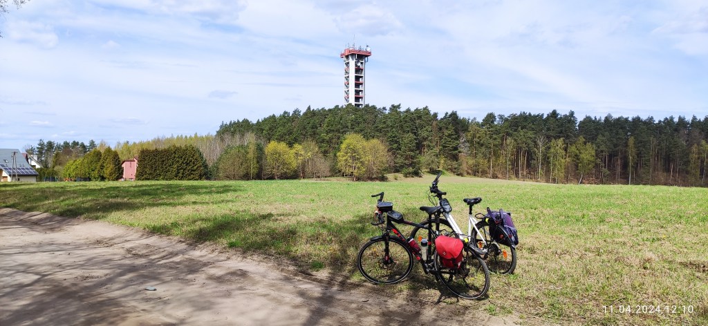 Minęliśmy ruiny kościoła w Szpęgawsku i dalej pojechaliśmy nieco rozjeżdżonym przez leśne maszyny, szlakiem rowerowym. Jeszcze w lesie wjechaliśmy na Kociewski Szlak Jeziorny. No, trzeba przyznać, że w tych rejonach szlaków rowerowych nie brakuje! Przez Ciecholewy przelecieliśmy bez zatrzymania. Na wysokości Trzcińska, zrobiliśmy parę zdjęć przy nadajniku-przekaźniku telewizyjnym i zapewne telefonii komórkowej. Diabeł jeden wie. Jednak ten przywrócił nam wspomnienia, bowiem był tego samego typu, co stawiane na Pojezierzu Drawskim, np w Toporzyku.