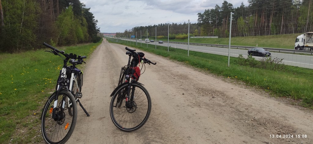 Potem powolutku ruszyliśmy w stronę kościoła, który jest doskonałym punktem orientacyjnym, i który widać nawet z autostrady A1. Potem przez Rokitki, gdzie wjechaliśmy na pieszy szlak ziemi tczewskiej i Waćmierek, dojechaliśmy do szosy nr 22. Tam musieliśmy jakieś 600 m przepedałować po tej ruchliwej trasie, po czym skręciliśmy na Brzuśce. Gdy dojechaliśmy do Waćmierza, skręciliśmy w prawo, w stronę wiaduktu nad autostradą A1. Za wiaduktem szutrowa droga biegła wzdłuż autostrady. Stanęliśmy na chwilę i wsłuchaliśmy się w hałas, który generowały auta. O dziwo, nie był to hałas silników, tylko świstu i oporu powietrza. Im szybciej jechał pojazd, tym większy świst docierał do nas.
