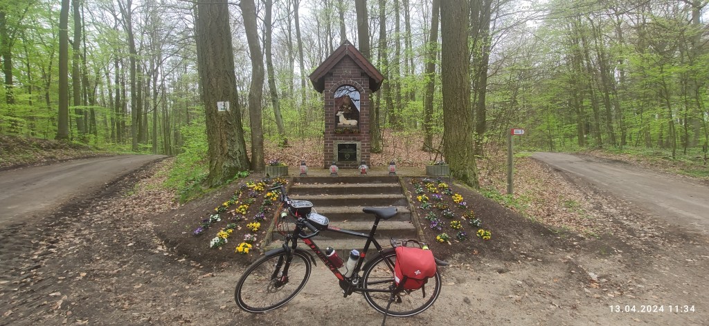 Praktycznie do Rywałdu (o dziwo, koło Radzynia Chełmińskiego też jest Rywałd) jechaliśmy z górki i z wiatrem. Było lekuchno i po asfalcie. W Rywałdzie trafiliśmy na informacje, że właśnie w tej okolicy kręcono Krzyżaków. I znowu zrobiło się nam na sercu walecznie. Za Brzeźnem Wielkim wjechaliśmy w las i wiatr już nam nie pomagał. W Bukowcu natrafiliśmy na kapliczkę myśliwską. Trzeba oddać, że była bardzo zadbana. No i wtedy zobaczyłem, że nie uruchomiłem zapisu śladu gpx. Czasem mi się to przydarza. Czasem mogę skorzystać z zapisu zegarka, ale nie zawsze się uda. Tym razem się nie udało.