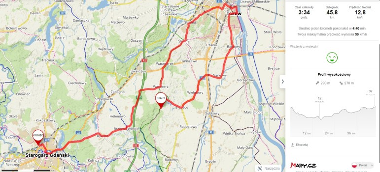 Tego dnia czekał nas najdłuższy etap naszej Kociewskiej rozkrętki. Zamierzaliśmy po raz kolejny odwiedzić rowerami Tczew. Miasto bardzo przyjazne rowerzystom. Równie jak Starogard Gdański. Pogoda dopisywała od trzech dni, także Ania spisała się znakomicie ze swojego odcinka odpowiedzialności.