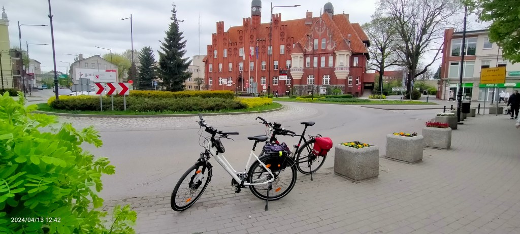 Przekroczyliśmy szosę 91 i tory kolejowe, którymi setki razy jechaliśmy na północ bądź południe. Tym razem zrobiliśmy to rowerami. W Narkowach skręciliśmy na północ i spokojnym asfaltem dojechaliśmy do Bałdowa. Mogliśmy pojechać do Knybawy, ale dwukrotnie przejeżdżaliśmy tamtędy jadąc rowerami z Tczewa do Malborka. Zdecydowaliśmy się jednak na wabiącą nas, ścieżkę rowerową wzdłuż najkrótszej trasy do Tczewa. Niestety, piękna ścieżka się urwała chwilę potem i do Tczewa wpedałowaliśmy po szosie. Do centrum nie prowadziła żadna ścieżka rowerowa. Minęliśmy Muzeum Wisły, które gorąco polecamy i dojechaliśmy do Urzędu Miejskiego. Pamiątkowe zdjęcia i przeszliśmy na pieszo do naszego ulubionego baru mlecznego Kociewiak. Bar ma uwiązy rowerowe za szybą. Mieliśmy chwilę na popas i ulubione jedzonko.