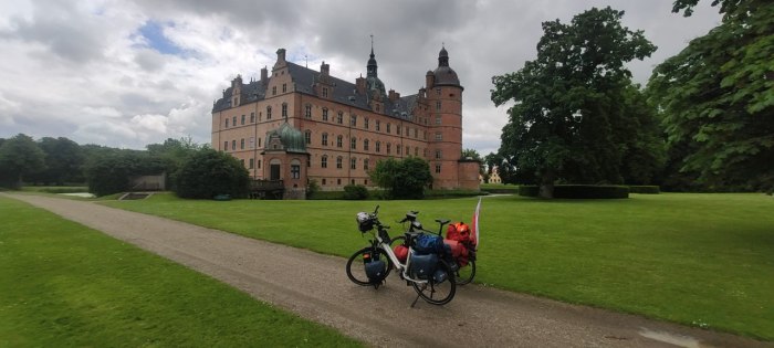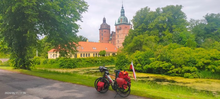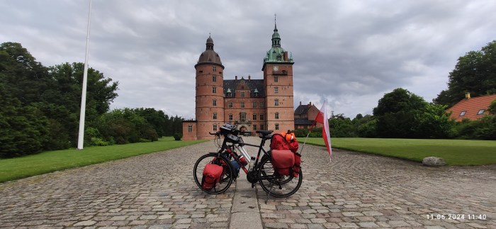 Przestało padać, zanim ujechaliśmy 2 km, czyli do zamku Gjorslev, choć pełnego słońca też nie było. Najfajniejsze, że wiatr osłabł od wczoraj, ale wciąż wiało nam w plecki. Czyli następny dzień promocji! Zamku niestety nie zobaczyliśmy z drogi. Był kompletnie zasłonięty ogromnymi budynkami gospodarczymi i bardziej przypominało nam dawny PGR. Po za tym wyczytałem, że wycieczki są dozwolone z wcześniejszym uzgodnieniem. Toteż minęliśmy zamek, nie dostrzegłszy nawet jego wysokiej wieży. W naszych planach był inny zamek, tuż za Vallø, parę kilometrów dalej. Chwilę potem wjechaliśmy na piękną rowerostradę, która ciągnęła się przez pola, ale wzdłuż szosy. Zauważyliśmy także znaczny wzrost liczby samochodów, a nawet rowerzystów.
