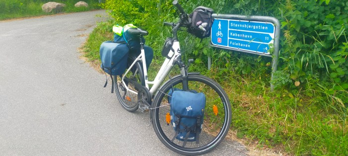 Parę kilometrów za Vallø, wjechaliśmy na szosę nr 261. Na skrzyżowaniu stały także drogowskazy dla rowerkowców. Oto znów byliśmy na EV7 i EV10 a do Kopenhagi pozostało 59 km. Z wiatrem w plecy i po rowerostradzie, nic nie było nam straszne.