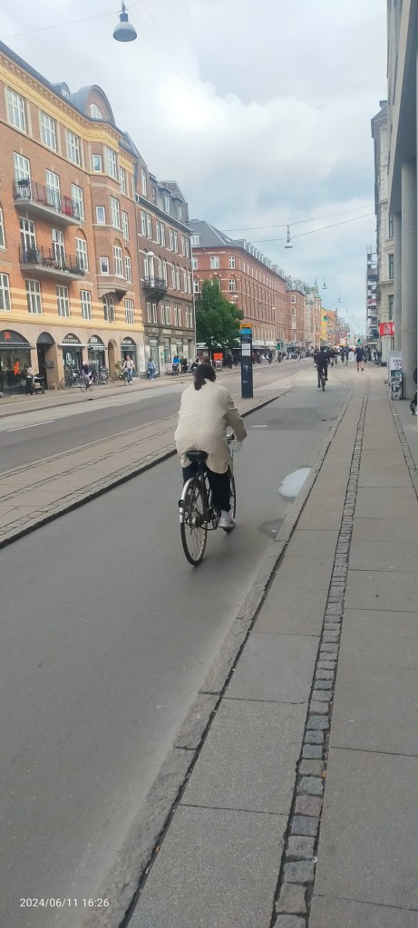 Od tamtej chwili, mijaliśmy coraz więcej ludzi i aut, ale przede wszystkim, wszelkiej maści rowerzystów. Nawigacja doprowadziła nas do takiej ścieżki rowerowej, która przecinała stolicę z północy na południe, i była całkowicie niezależna od ulic. Wiodła nas przez parki i skwery. Co chwila przejeżdżaliśmy pod jakimś małym wiaduktem, tylko dla rowerów. Choć ścieżka nie była za szeroka, to miejscowi pędzili na rowerach, jak opętani. Powstrzymywały ich tylko światła na skrzyżowaniach. Za to 90 procent z nich, przed zatrzymaniem się, podnosiła lewą rękę w górę. Prosty znak podnoszący bezpieczeństwo jazdy. Rowerzystów i parkingów pełnych rowerów było coraz więcej i więcej. W końcu zrozumieliśmy, że rowerzystów było całe morze, a do ich dyspozycji było drugie morze ścieżek rowerowych! A ta nasza ścieżka, doprowadziła nas prościutko do adresu naszego noclegu. Nawet nie wiedzieliśmy, kiedy wjechaliśmy do Kopenhagi.