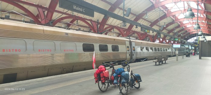 Dworzec centralny, nazywany przez tubylców København H, był bardzo przyjazny rowerzystom. Choć budynek był zabytkowy, to wind, schodów i przestrzeni było pod dostatkiem. Bilety do Malmö kupiliśmy w automacie, których na dworcu było multum. Zasięgnąłem także języka u Pana Podpowiadacza na dworcu, czy bilety są na konkretny pociąg czy na dowolny. Okazało się, że na dowolny. Pociągi kursowały co około 20 minut. Załadunek do wagonu z miejscami na rowery – czysta przyjemność. Rowerów nie trzeba było wieszać i jechały na stojąco. Gdy wyjechaliśmy z tunelu, wjechaliśmy na most nad Sundem. Pociąg jechał dolnym pokładem, a górnym auta. No dla mnie była to jedna z moich Top 10 atrakcji (filmik).