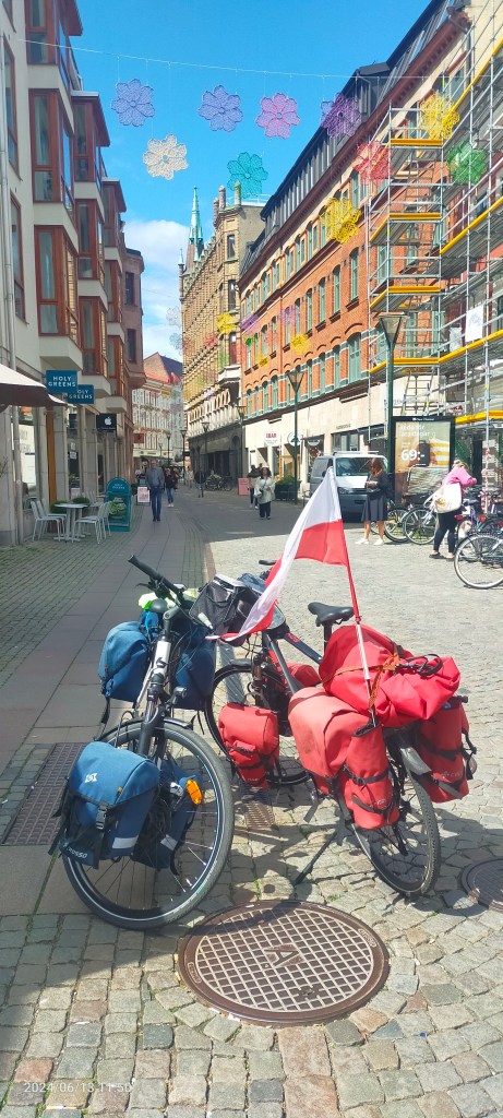 Gdy wysiedliśmy z pociągu, postanowiliśmy dla odmiany przejechać się po mieście rowerami. W centrum niestety nie można było jeździć po deptakach, o czym informowały znaki tylko w języku szwedzkim. Musiałem przetłumaczyć sobie translatorem, bo szwedzki wcale taki oczywisty nie był. I tak trafiliśmy na polski sklep i jakoś tak weselej się zrobiło nam na twarzach. Potem, szukaliśmy miejsca do zjedzenia posiłku. Z mostu z butami zobaczyłem złote krzesła i stoły. Zajechaliśmy i wszedłem do środka. A tam menu tylko po szwedzku. Zapytałem po angielsku o najpopularniejszą ofertę i dostałem odpowiedź w takim samym języku. Wyszedłem na zewnątrz, objaśniłem Ani w czym rzecz i wróciłem do środka, złożyć zamówienie. I ten sam człowiek zza lady, zapytał mnie po polsku, dokąd jechaliśmy? A jakież było moje zdziwienie!