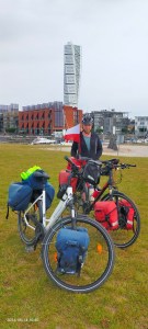 Po super śniadaniu w hotelu, dorowerkowaliśmy do punktu widokowego, gdzie doskonale było widać specyficzny, spiralny wieżowiec, Turning Torso i oczywiście most nad Sundem. Ludzi jak na lekarstwo a terenu otwartego – po horyzont. Zmierzaliśmy ścieżką rowerową wzdłuż plaży, w stronę mostu, by przejechać pod nim. Ścieżka oznaczona numerem 3, pokrywała się z EV10.