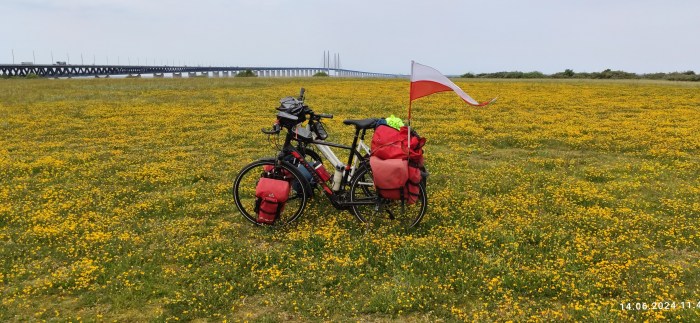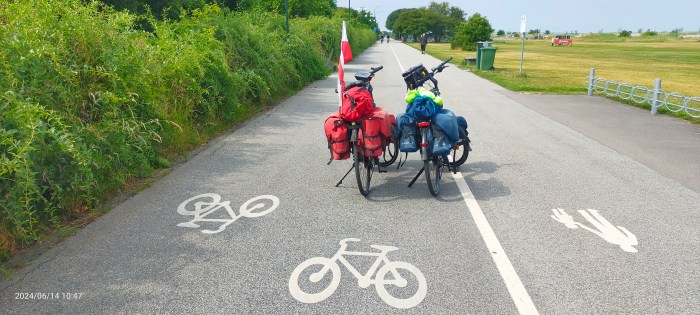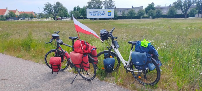 Za Höllviken skręciliśmy na wschód i od wtedy jechaliśmy idealnie pod wiatr. Jechaliśmy pośród pól i nasze TIR-y stawiały taki opór, że szybciej jak 11 km/h się nie dało. Nie zależało nam jednak na czasie. Plan dnia zakładał tylko dojazd do Trelleborga, a zaokrętowanie na prom mieliśmy następnego dnia. I tak sobie pyrkaliśmy powoli. Ja z przodu, Ania w tunelu aero za mną. Wtedy też, dogoniliśmy dwóch Niemców. Chyba wnuczka i dziadka z tym, że wnuczek miał już brodę niegoloną. Stanęliśmy i dawaj pogaduchy. Oni byli w trakcie wyprawy wokół Bałtyku NA RAZ! Mieli objechać morze rowerami z namiotem w trzy miesiące. Średnio, po 100 km dziennie. Tego dnia mieli dojechać do Ystad ale dziadek kręcił głową, wyraźnie wskazując na wiatr, że chyba dziś nie dojadą. Przez Trójmiasto mieli przejeżdżać w sierpniu. Życzyliśmy sobie powodzenia. No i oczywiście do zobaczenia na szlaku!