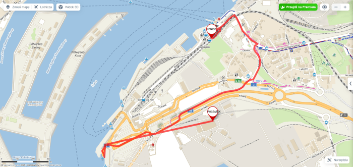 Widok polskiego brzegu najbardziej ucieszył Anię. Przeżyła ten rejs w niemałym stresie. Dlatego, zaraz po sygnałach, że można iść po rowery, ruszyliśmy jako pierwsi, ale pokład opuszczaliśmy jako ostatni (filmik). Najpierw wyjechały ciężarówki. Na dodatek rozpadało się ulewnie i schowaliśmy się pod jakimś łącznikiem.