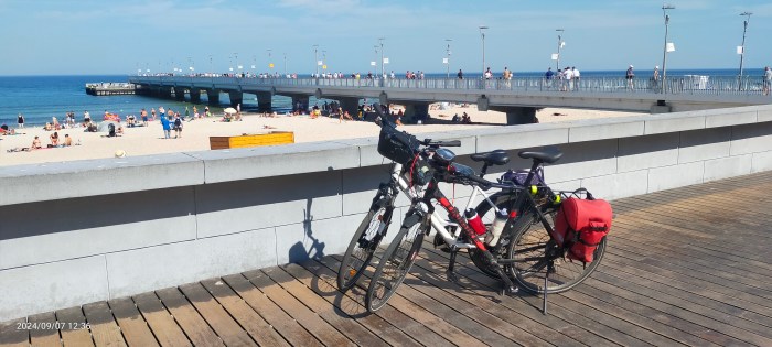 Rogowo, to kiedyś była niemiecka jednostka wojskowa z wodnosamolotami. Potem stacjonowało tam Wojsko Polskie i przejazd był dla cywilów zamknięty. Teraz po jednostce zostały budynki i betonowe zjazdy do wody, budowane jeszcze przez Niemców. No i oczywiście dobudowano wiele, wiele nowych nowoczesnych apartamentowców, które powstały jak grzyby po deszczu. Wiele jeszcze było w trakcie budowy. Zadbano też o nową ścieżkę rowerową, która wciąż była odrębna i bardzo bezpieczna. Dźwirzyno, to już mnóstwo turystów na ulicy. Ścieżka rowerowa dalej pięknie utrzymana a w drugiej części Dźwirzyna, pięknie poprowadzona pomiędzy drzewami. Tuż przed Grzybowem, ścieżkę rowerową oddzielono od pasa drogowego, i poprowadzono przez lasek, blisko wydm. Jeden z ładniejszych odcinków w Polsce. Co chwila ławeczki, nawet przenośne toalety. Tym laskiem dojechaliśmy do samego Kołobrzegu. Przejechaliśmy nowym mostem portowym i dojechaliśmy do mola. No tam, to już tłumy turystów, artystów i zabawiaczy wszelkiej maści. Zrobiliśmy sobie krótki odpoczynek. Potem promenadą przespacerowaliśmy się do latarni morskiej. Choć był wrzesień, Kołobrzeg ciągle był przeludniony.