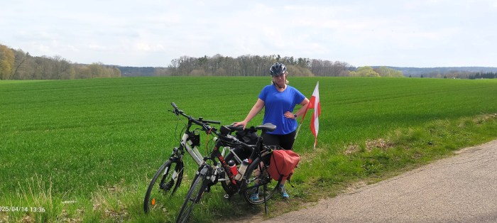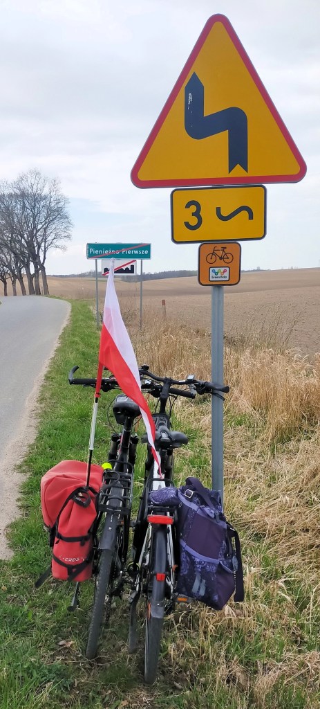 Z Krosna pojechaliśmy na północ, przez las. Niestety, jak to w Polsce, szutrowa i twarda nawierzchnia, zamieniła się w piaskową. Mus było prowadzić. Na szczęście tylko coś koło jednego kilometra. W Kumajnach wjechalismy na szosę, a w Henrykowie na szosę 507, która doprowadziła nas do Pieniężna. Po drodze zauważyłem sporo bocianów. Szczególnie dużo było ich w Cieszętach. Cieszą się dziecięta, z boćków w Cieszętach!