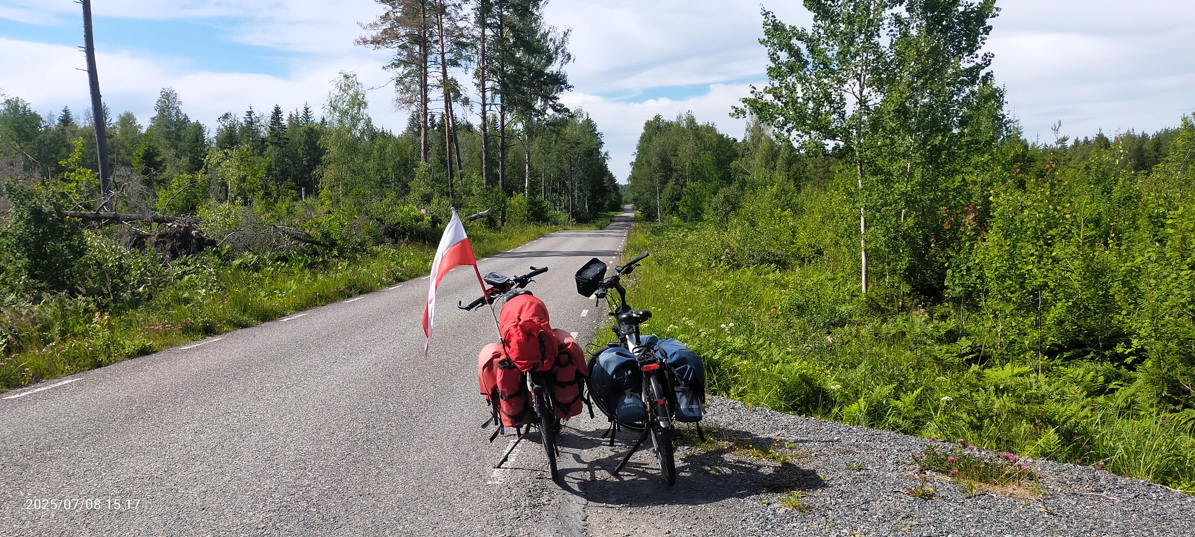 Od samego początku, rowerkowalismy szosą. Aut bardzo mało. Z każdym kilometrem coraz mniej. Słońce wyszło na dobre. Wjeżdżaliśmy w coraz to węższe asfalciki. No, a wiadomo nie od dziś, że jak jedzie się ciągle po asfalcie, to i tyłek szybciej się ugniata i przerwy trzeba czynić częściej. No to stawaliśmy. Dodatkowo, nie sprzyjał nam wiatr. Dużo jechaliśmy po otwartej przestrzeni i zaczął nam doskwierać. Tuż przed Hallsatvik zauważyłem znaczek rowerowego, szwedzkiego szlaku brzegowego Kustlinjen. Zupełnie przypadkiem, bo nie rzucał się w oczy.