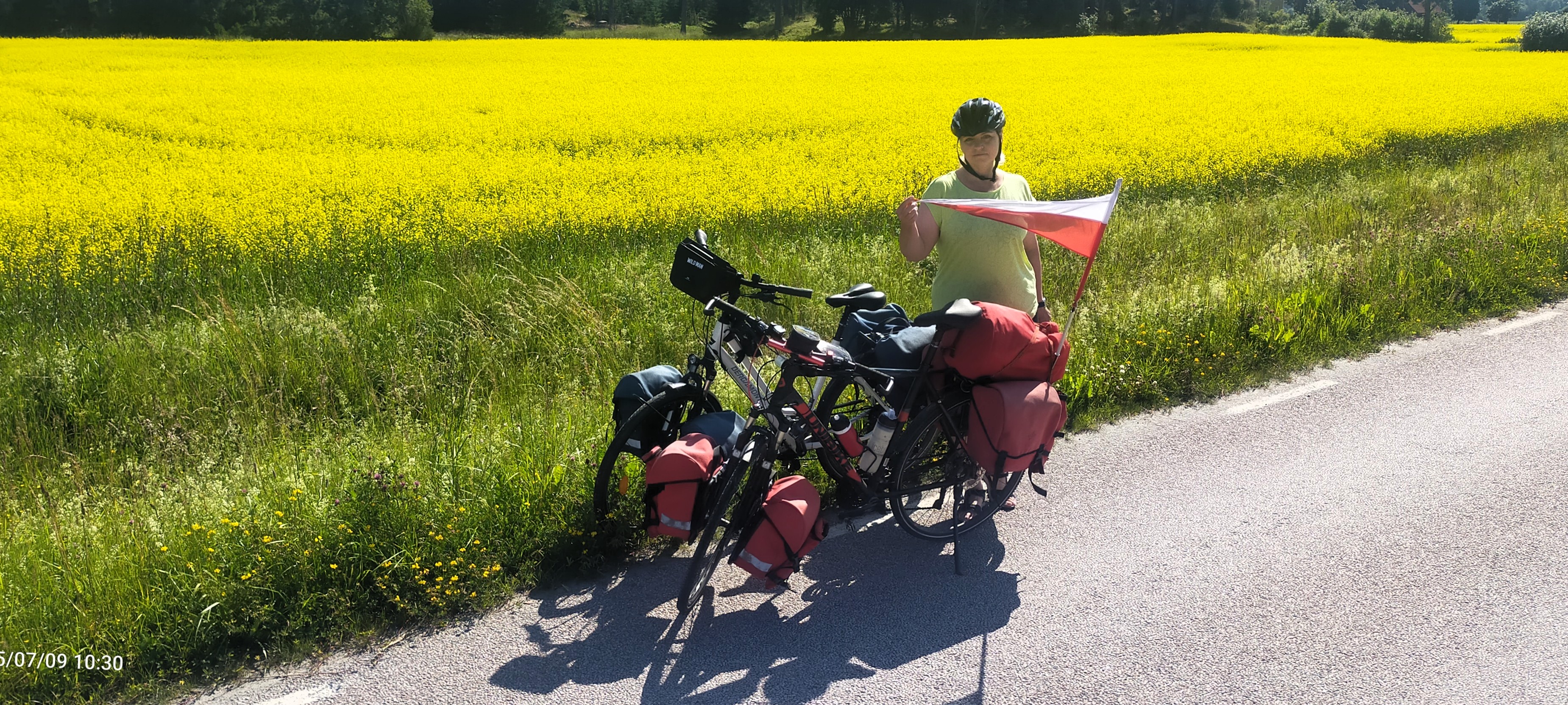 Za Hökhuvud, zjechaliśmy w podrzędną szosę na północ i zobaczyliśmy kwitnący… rzepak! No nie mogliśmy się powstrzymać, by nie zrobić sobie zdjęcia na tle. W Polsce już niektórzy przymierzali się do omłotów, a tu kwitł na całego, takim szwedzkim żółtym. Od razu pojawiły się na naszych koszulkach te małe, czarne owady.