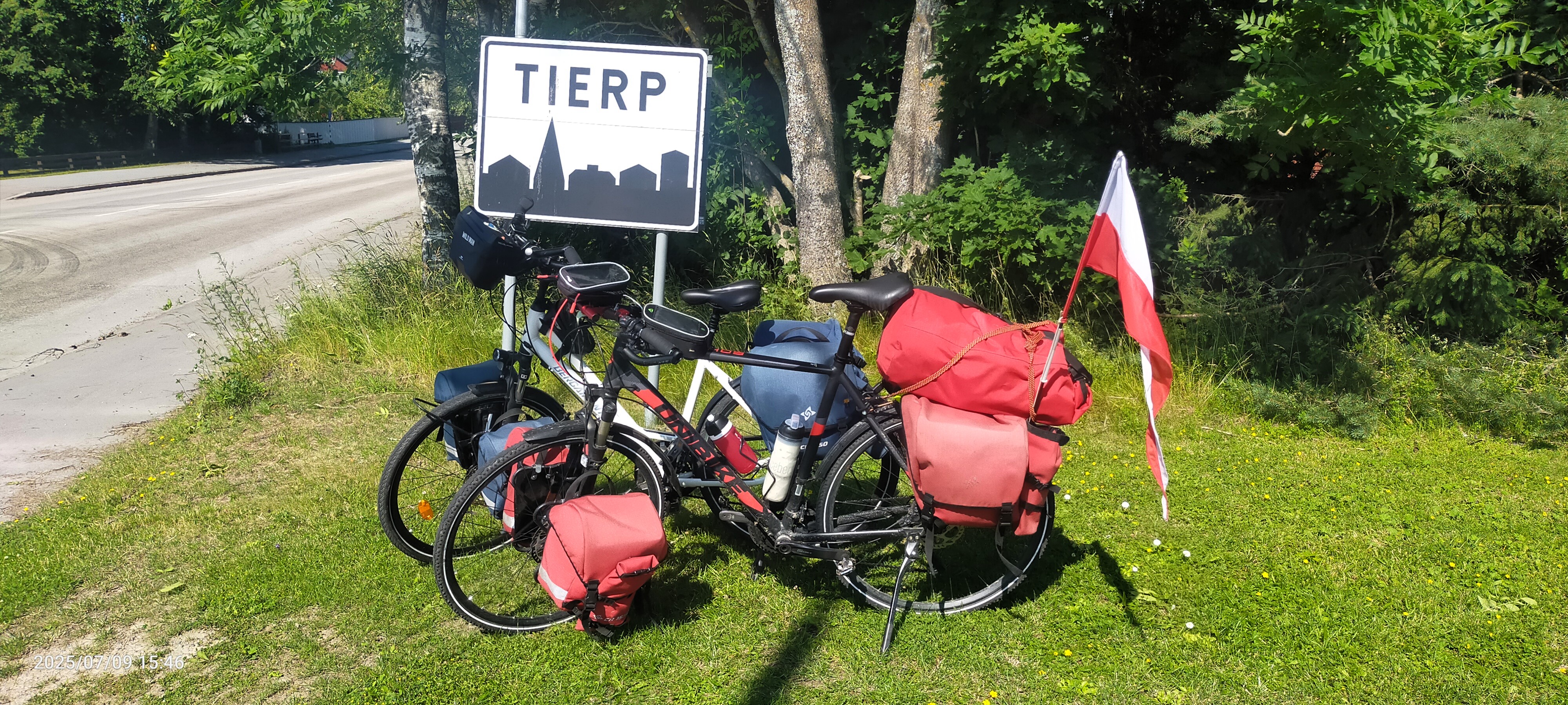Cykelspåret’em po nasypie, jechało się sielsko-anielsko. I znów zaczęło nieźle wiać. Na szczęście idealnie w plecy. Toteż, gdy dojechaliśmy do szosy 292, która miała poszerzone pobocze, bez chwili namysłu władowaliśmy się na nią i znowu jechaliśmy 30 km/h. Tak dmuchało! I zupełnie nie wiadomo kiedy, dorowerkowaliśmy naszymi TIRami do Tierpu.