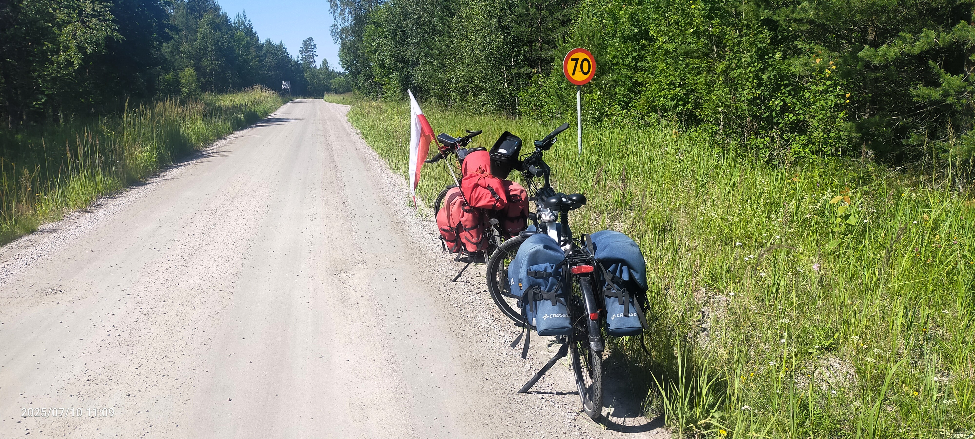 W Valla zjechaliśmy z szosy i zaczęła się znów ładna, leśna szutrówka. Wiatr nam już nie przeszkadzał i mieliśmy dużo cienia. Przyszedł czas na kolejne użycie drona. Ale było zabawy! No i została nam pamiątka do filmu. Że szutrówki w Szwecji były w idealnym stanie pisałem już wcześniej, ale żeby połamać nasze dotychczasowe mniemanie o tych nawierzchniach, Szwedzi postawili przy nich znaki drogowe z ograniczeniem prędkości. Do 70 km/h!!! Asfalt powrócił przed Myrbo, ale żeby czuć było różnicę w pedałowaniu, to nie za bardzo.