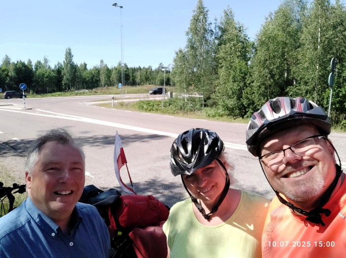 Za Skutskär minęliśmy potężną papiernię, którą widać z kilkunastu kilometrów. Jednak w powietrzu nie było czuć zapachu, podobnego do tego ze Świecia nad Wisłą. I dosłownie chwilę potem, zatrąbił na nas samochód. Autem w przeciwnym kierunku jechał, a jakże, Robert!!! Pomachaliśmy sobie. Ania miała jednak dobrego czuja, że spotkamy się jeszcze raz. Ale, żeby było jeszcze bardziej niesamowicie, po paru kilometrach, za Furuvikiem, przy skrzyżowaniu z szosą X 533 stał… Robert! Machał do nas, byśmy do niego podjechali. Zatrzymaliśmy się przy jego aucie. Robert wyciągnął z bagażnika… lody. Poczęstował nas, czym bardzo nas ujął. Po raz kolejny zaczęliśmy rozmawiać o wszystkim. Temat gonił temat. Dużo dowiedzieliśmy się o stylu życia w tej części Szwecji. Robert odpowiedział na wszystkie nasze pytania. Co za niesamowity człowiek! I do tego miał w sobie energię do potęgi. Nie przymierzając, reaktor jądrowy!!! Kiedyś miałem takie powiedzenie, że na szlaku spotkasz kogoś dwa razy. Robert tę tezę połamał. Pierwszy raz w życiu, spotkaliśmy kogoś po trzykroć!!! Pozdrawiamy serdecznie!